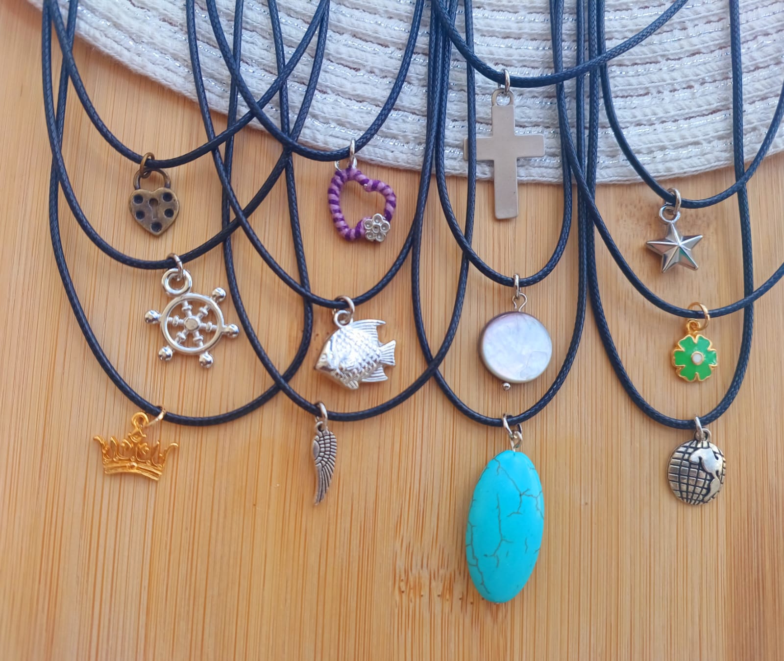 Pingentes: Metal, Pedras Naturais, Madrepérola, resina entre outros materiais.